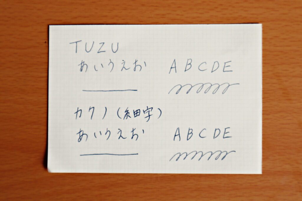 写真上が『TUZU』、下がパイロットから販売されている『カクノ』で書いた文字になります。